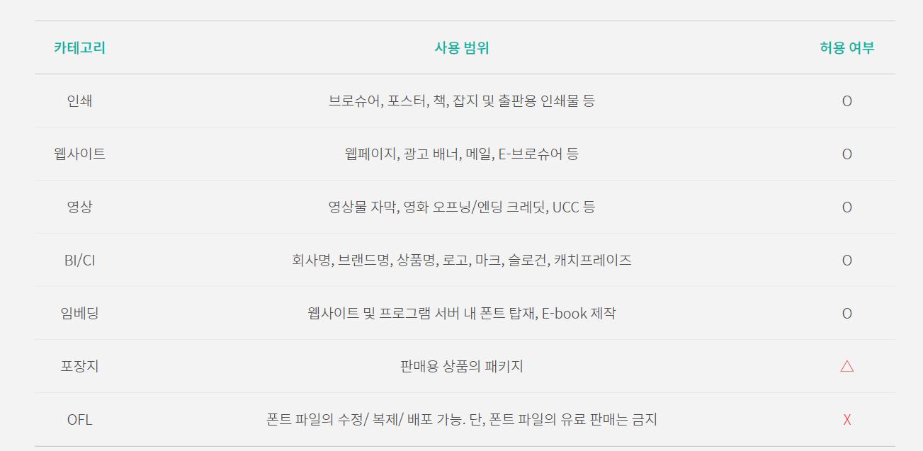 폰트명을 클릭하고 들어가보면 하단에 각 폰트에 대한 라이센스 관련 문구가 있습니다. 잘 확인해보시고 사용하시기 바랍니다. 상단 영역에 있는 다운로드 버튼을 통하여 폰트를 다운로드 해주세요.