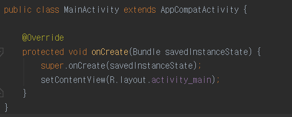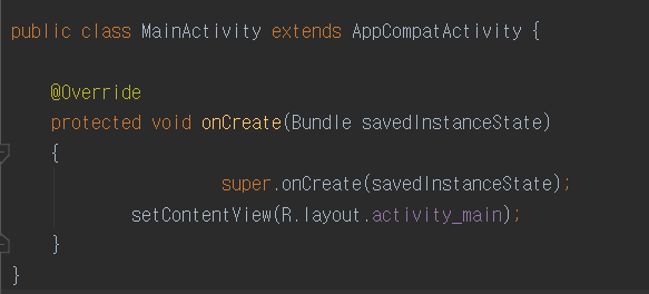 onCreate 함수안에 두 줄의 코드를 일부러 정렬을 엉망으로 만들었습니다. 안드로이드 스튜디오 상단 메뉴바에서 Code- Reformat Code 메뉴를 누르거나 단축키 Ctl+Alt+L을 누르면 아래와 같이 자동정렬이 됩니다.
